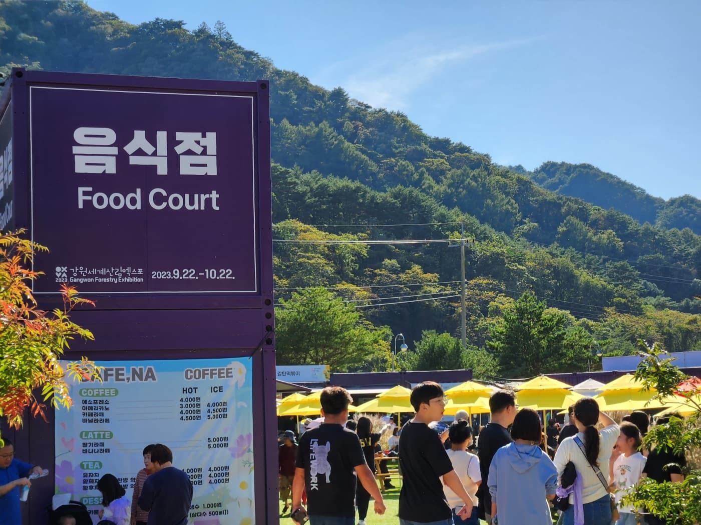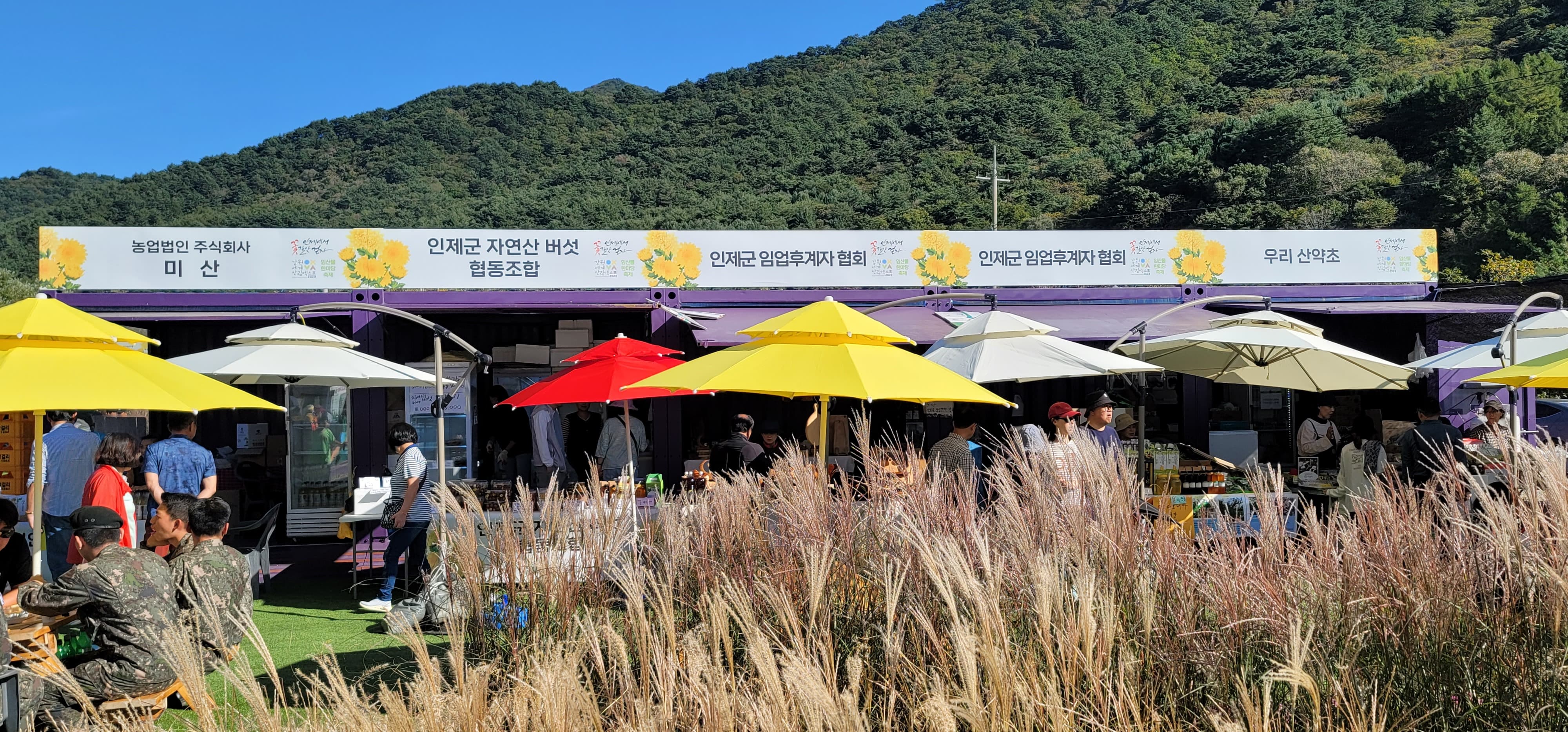 축제에 빠질 수 없는 것이 공연과 체험 프로그램입니다. 인제가을꽃축제장에서도 다채로운 공연과 체험프로그램이 진행되고 있습니다. 또한 체험부스 및 먹거리 부스가 일반 축제장에서는 몽골텐트를 많이 이용하는데요 인제가을꽃축제장에서는 바닥에 인조잔디를 깔고 보랏빛 컨테이너를 활용하고 있습니다.