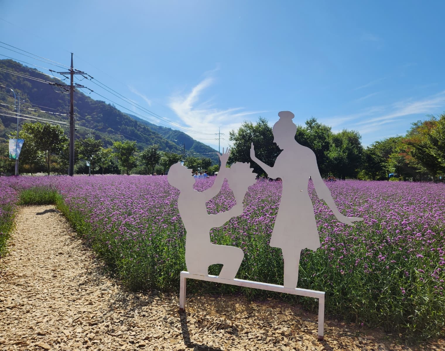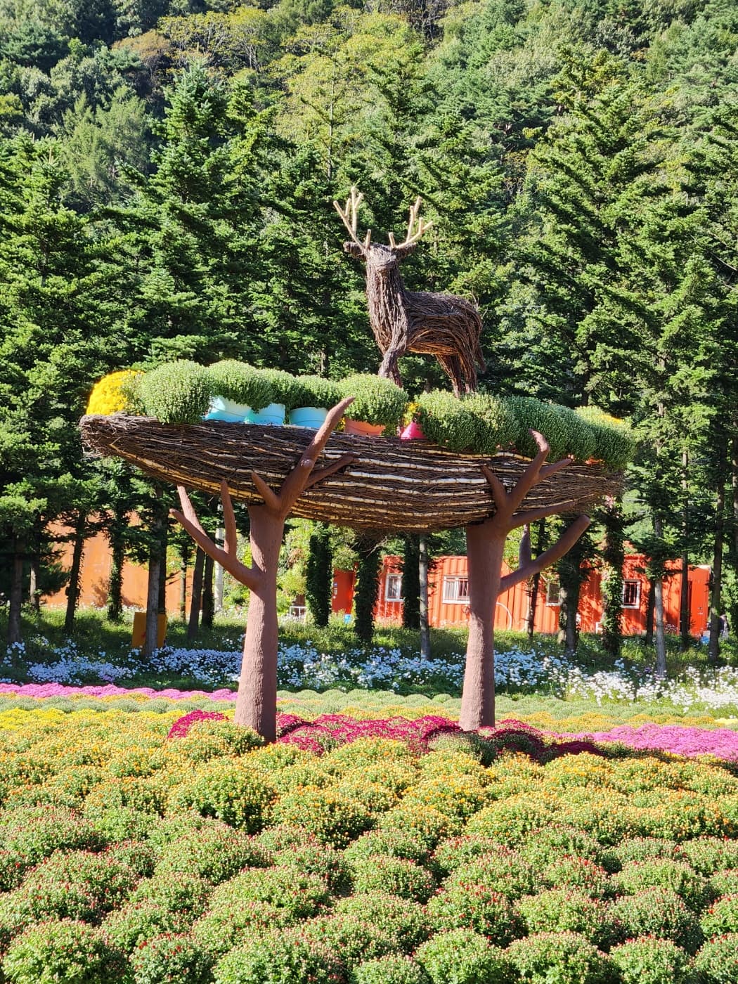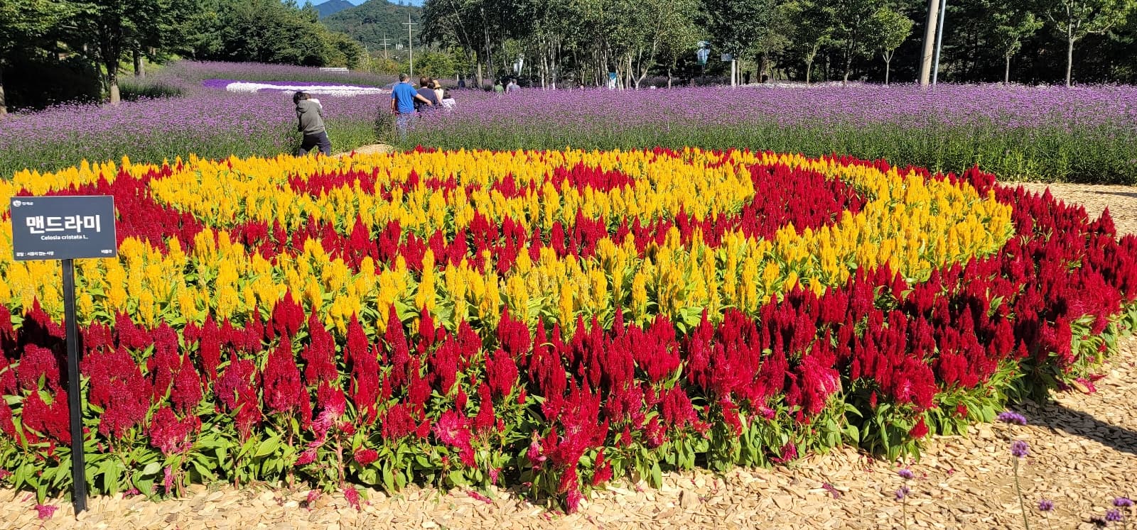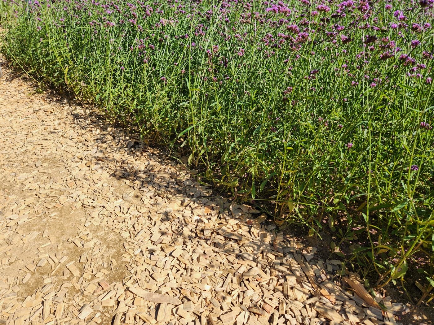 꽃밭사이 길에 뿌려진 나무조각은 마치 숲을 걷고 있는 것 같습니다