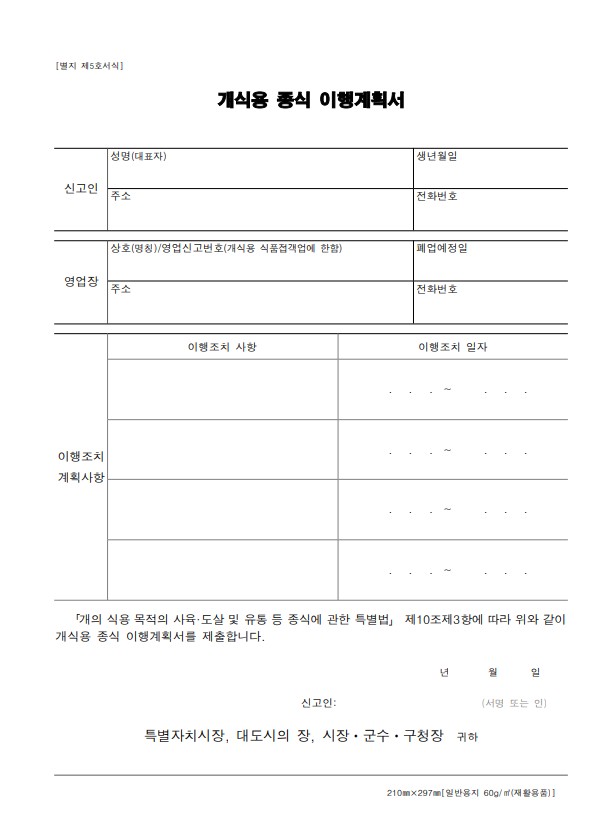 | 시설물 철거 등 폐업계획 | 개 식용관련 시설물별 철거기간 및 계획 그리고 폐업에 필요한 이행조치를 구체적으로 명시합니다 |