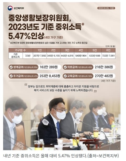 지급 대상 선정도 지자체별로 조금씩 다른데요 대부분 저소득층 가정, 한 부모가정 등 기준 중위소득에 따라 기초생활수급자(생계, 의료), 차상위계층, 중증장애인 등 조금씩 다릅니다. 그럼 국가 복지 지원사업 지급 대상을 결정짓는 기준점인 기준 중위소득이란 무엇일까요? 쉽게 말해서 국민들의 소득을 일렬로 쫙 폈을 때 가장 중간에 오는 값을 중위소득이라고 말합니다. 그리고 기초생활보장 급여별 선정기준 등에 활용하기 위해 국민가구 소득의 중위값을 기준 중위소득이라고 합니다. 2023년 4인 가구를 중심으로 기준 중위소득이 5.47% 인상되었고 앞으로도 더 많은 복지서비스가 제공된다고 합니다.