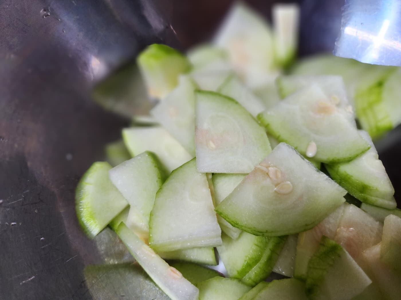 ⑤ 볼에 수분이 제거된 애플수박을 넣고 갖은양념으로 무쳐줍니다