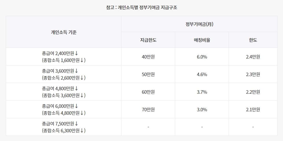 ※ 납입한 금액에 비례해 소득구간별 정부기여금 지원